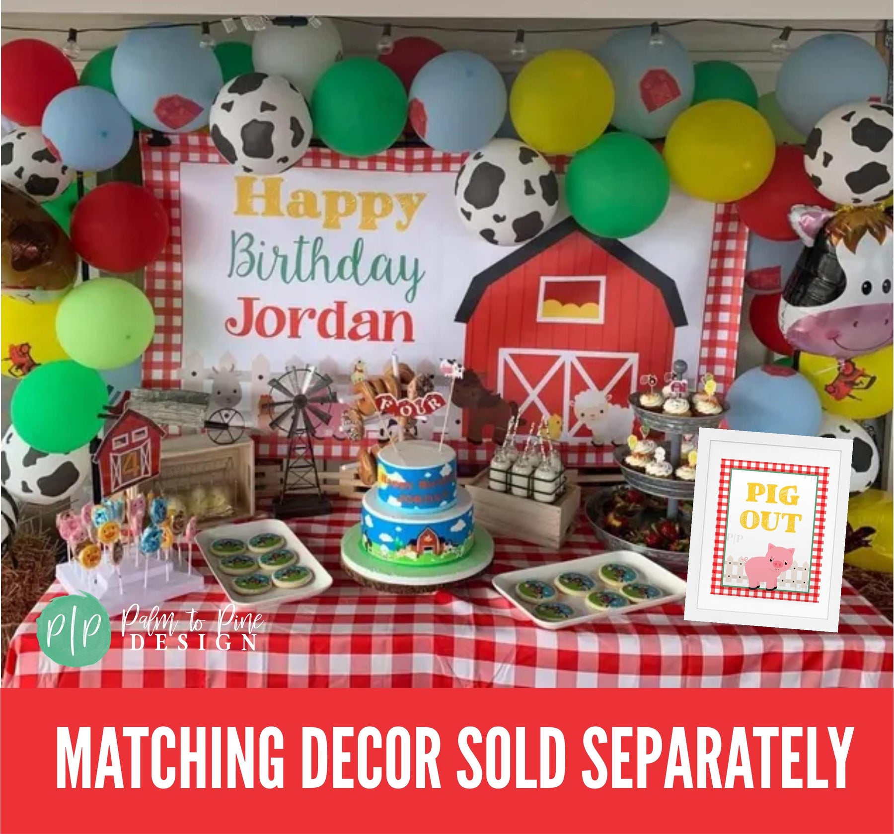 Bring some barnyard fun to your kids farm birthday party food or dessert table with this printable “Pig Out” sign! Featuring a cute pink pig illustration and a classic red gingham border for your farm birthday bash! This instant download sign perfectly matches our Farm Birthday Banner and coordinates with barnyard or country-themed celebrations.