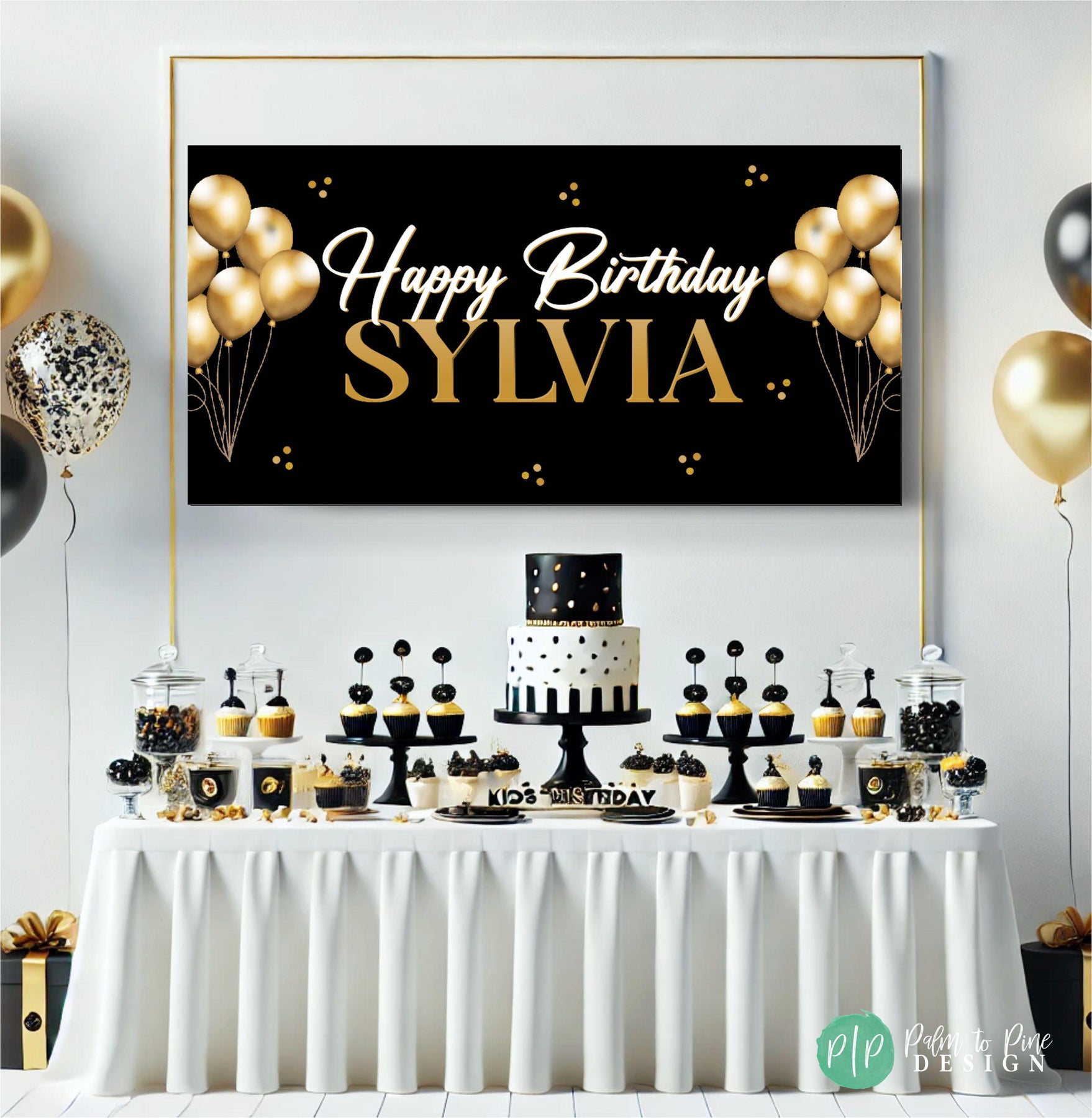 Featuring a bold black background, metallic gold accents, and gold balloons, this banner adds a sophisticated touch to your event décor. Personalize it with any name and age to make your celebration truly special.