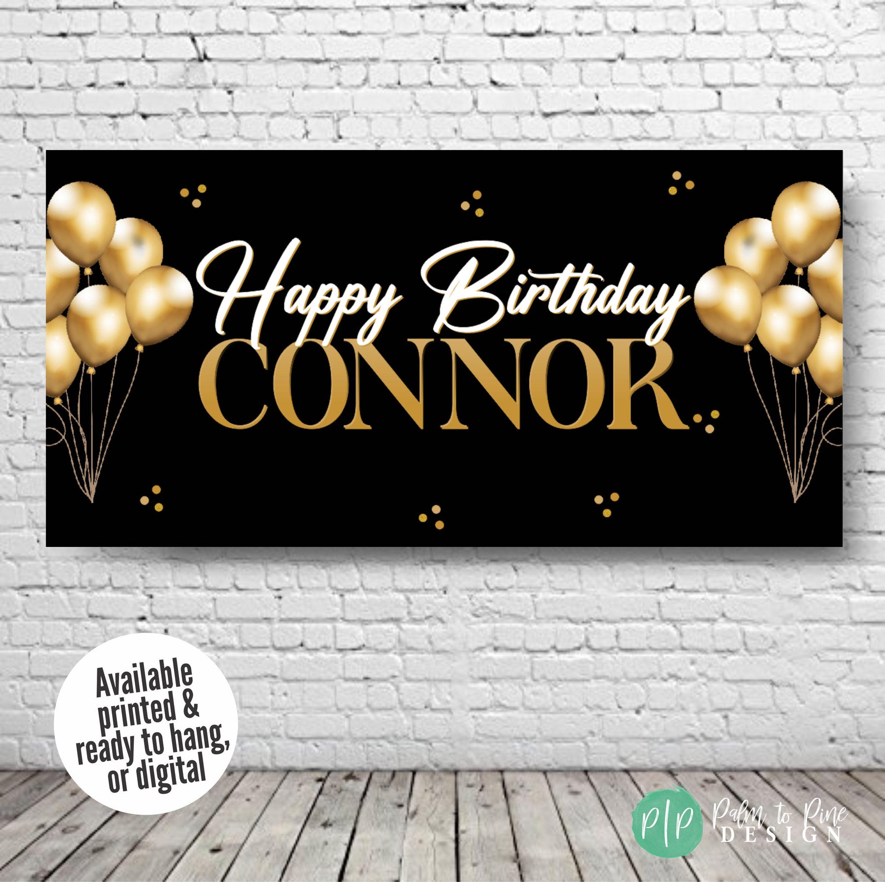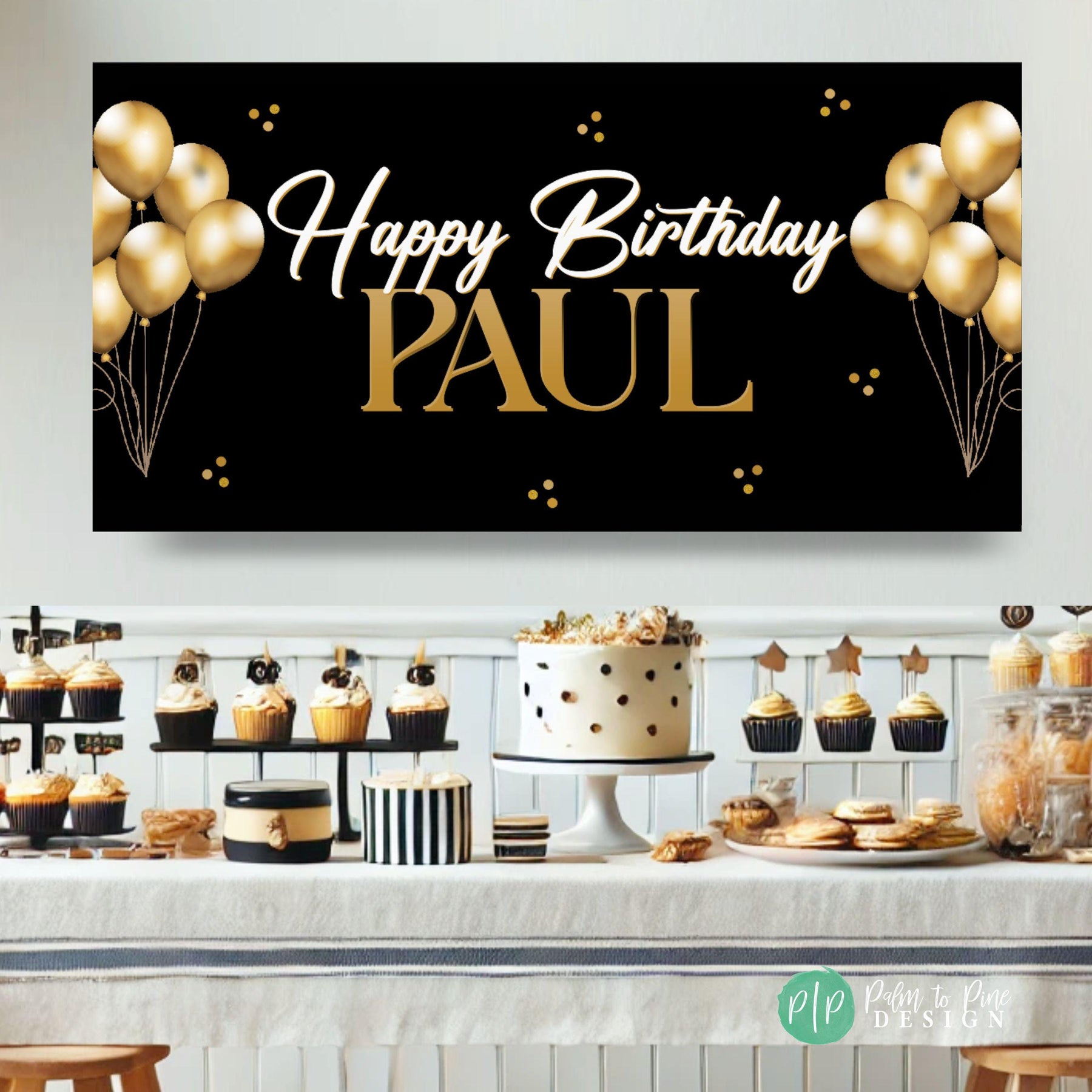 Celebrate in style with this black and gold personalized birthday banner — perfect for milestone birthdays, retirement parties, or any age celebration!