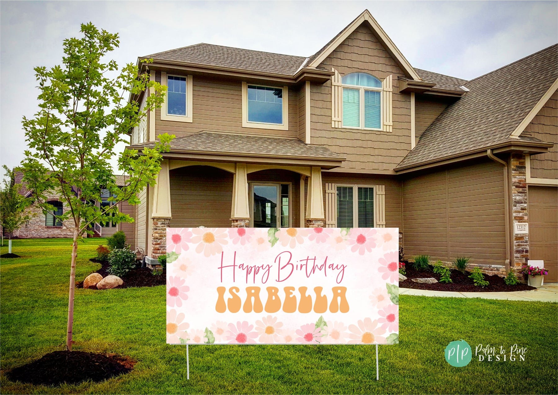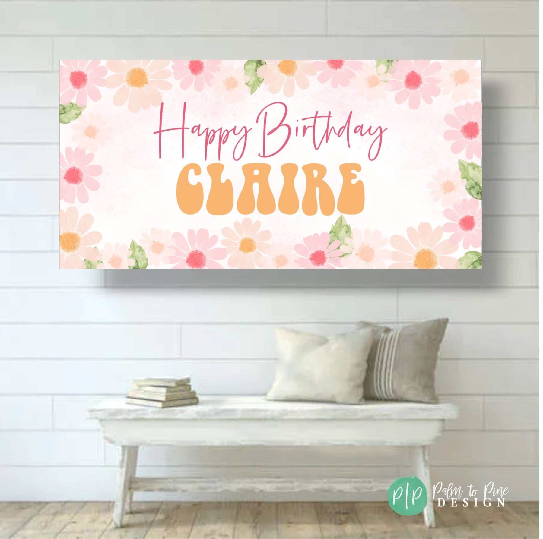 This pink and peach daisy personalized birthday banner is the perfect decoration to make a statement for your floral Birthday party for any age! The wording and age can be customized for your little girls birthday party. This personalized vinyl photo backdrop banner comes ready to hang, or available as a digital option to print locally and looks darling behind a dessert table, hanging in your front yard or at a park, entryway or at a backyard flower party!