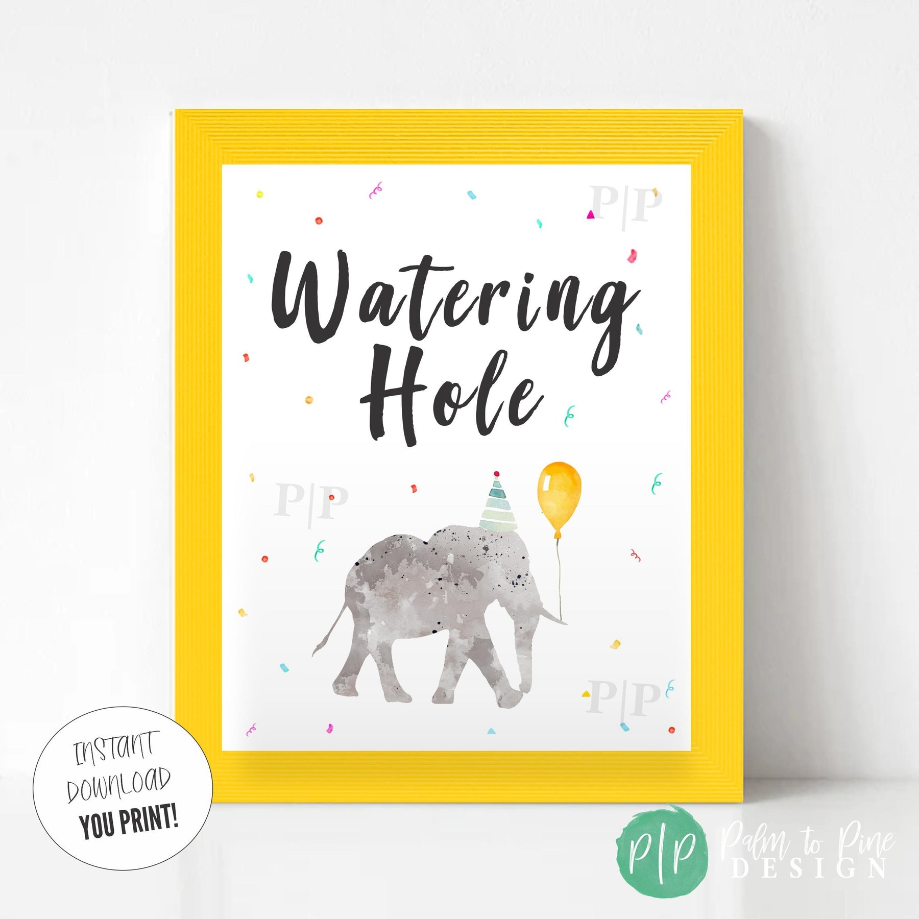 Celebrate at your Party Animal Birthday Party with this “Watering Hole” drink station sign! The cute watercolor elephant in a party hat surrounded by colorful confetti makes this instant download printable sign the perfect finishing touch for your jungle, safari, or Party Animal birthday theme for kids.