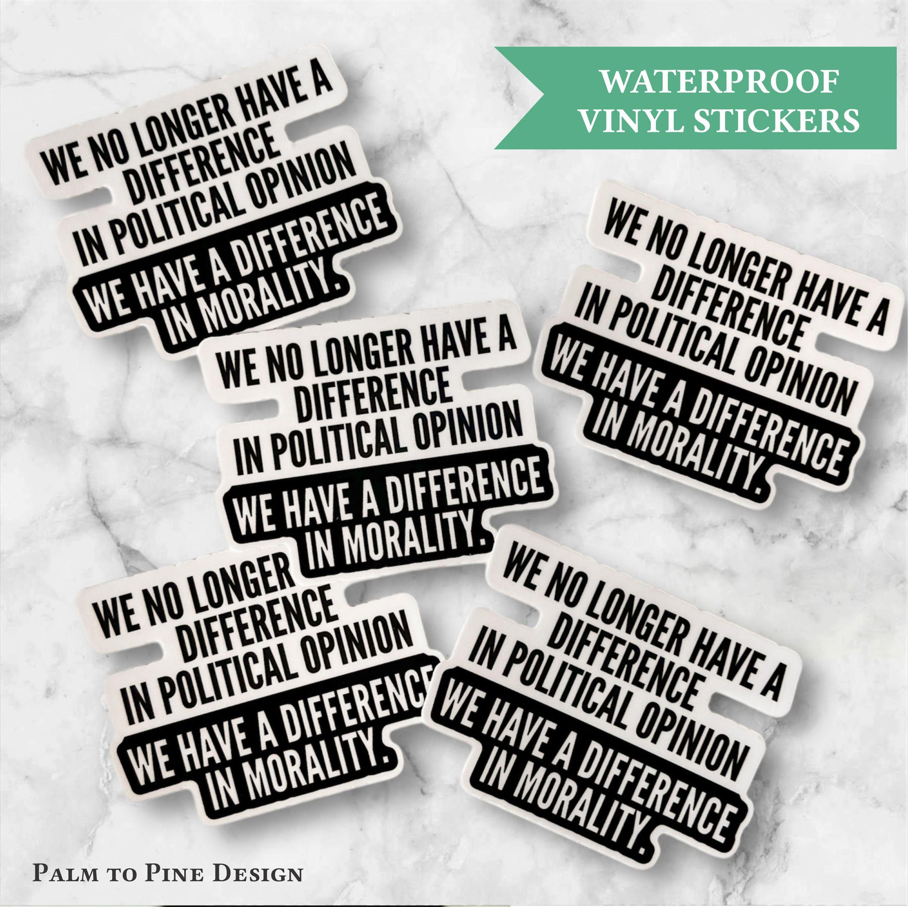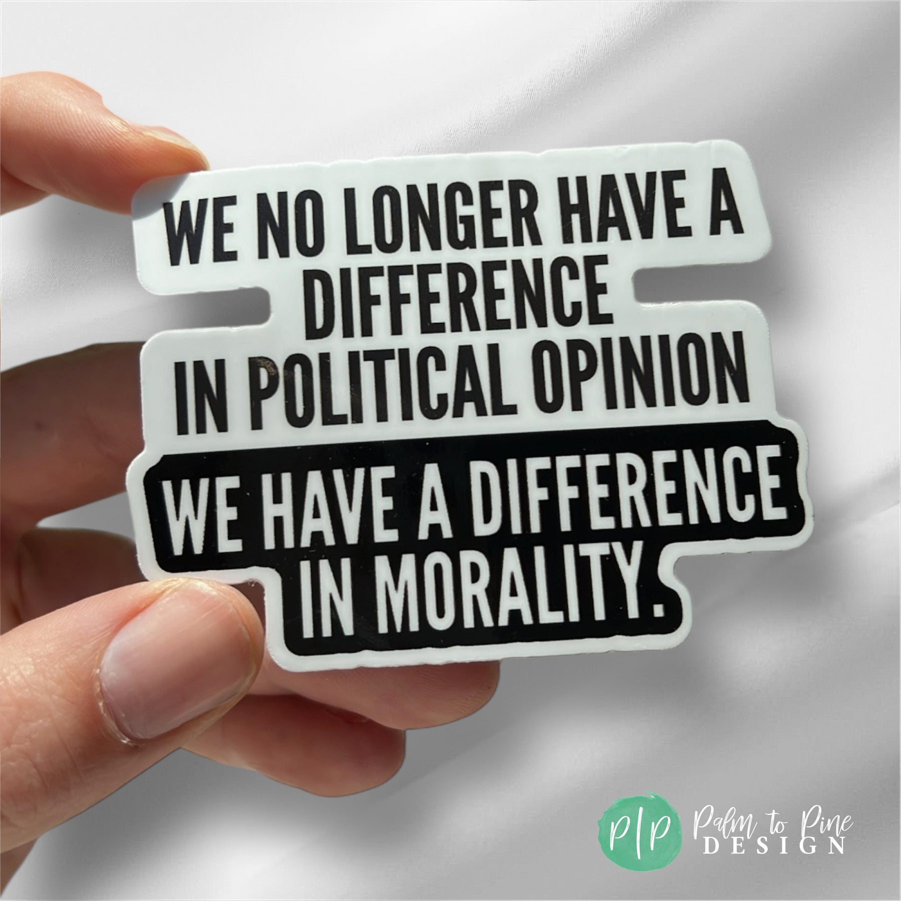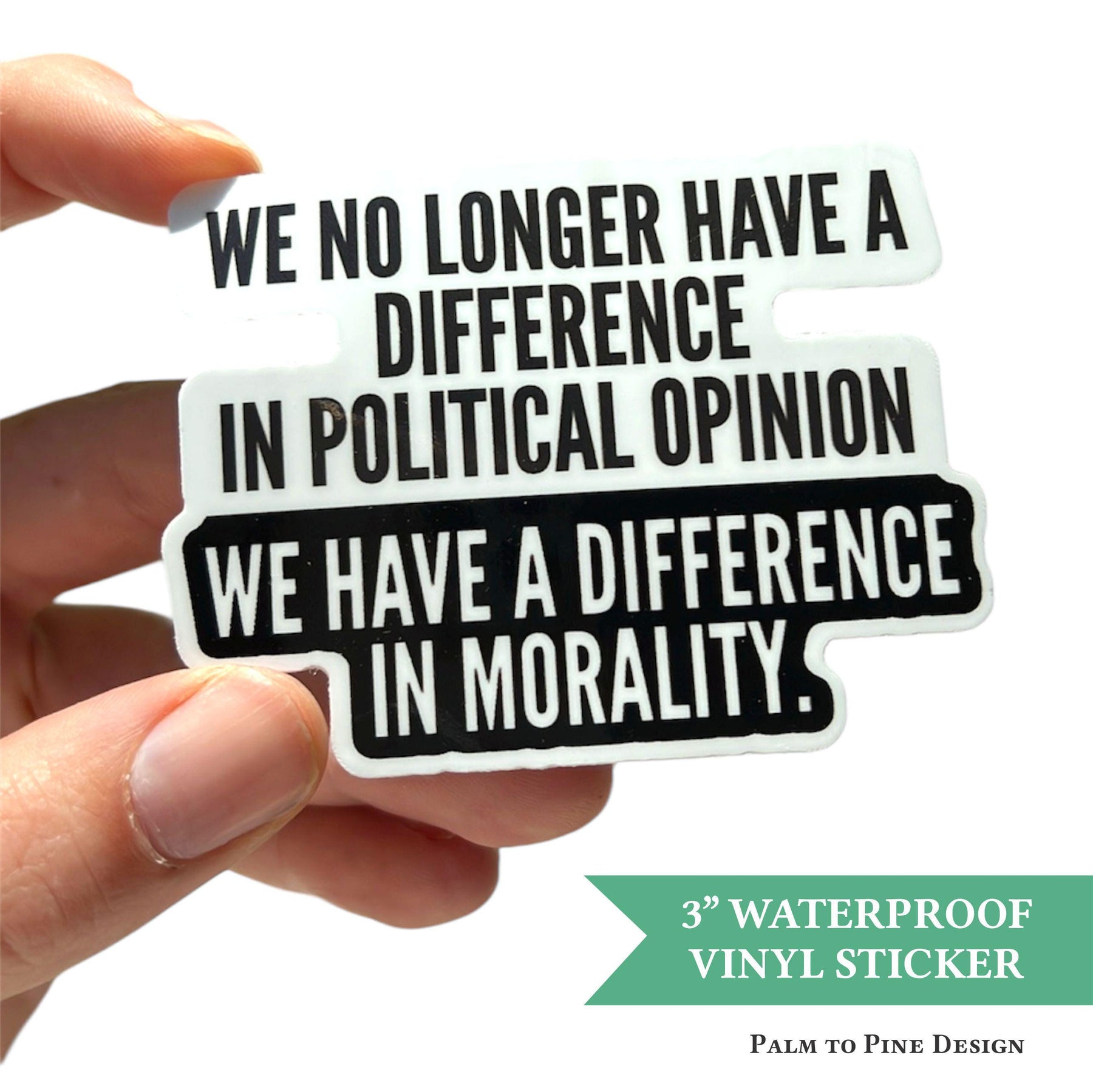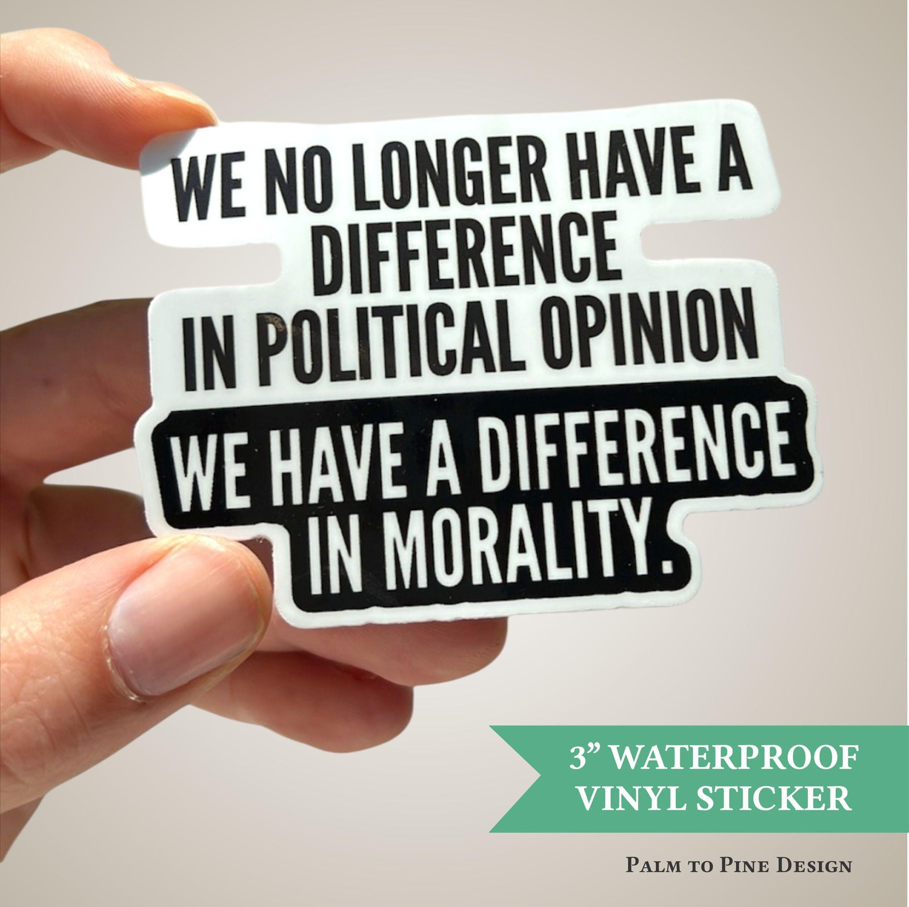 This Hands Off political vinyl waterproof sticker is the perfect way to raise awareness and demand justice and equality for a human rights voice that matters. This dishwasher safe resist sticker measures 3" long and the message reading "We no longer have a difference in political opinion, we have a difference in morality" supports democracy and anti-racism. Proudly put this waterproof democratic sticker on your water bottle, laptop, car bumper sticker or more and display it at activists protests, rallies or marches to defend democracy, bureaucracy, women's rights, immigration and more.
