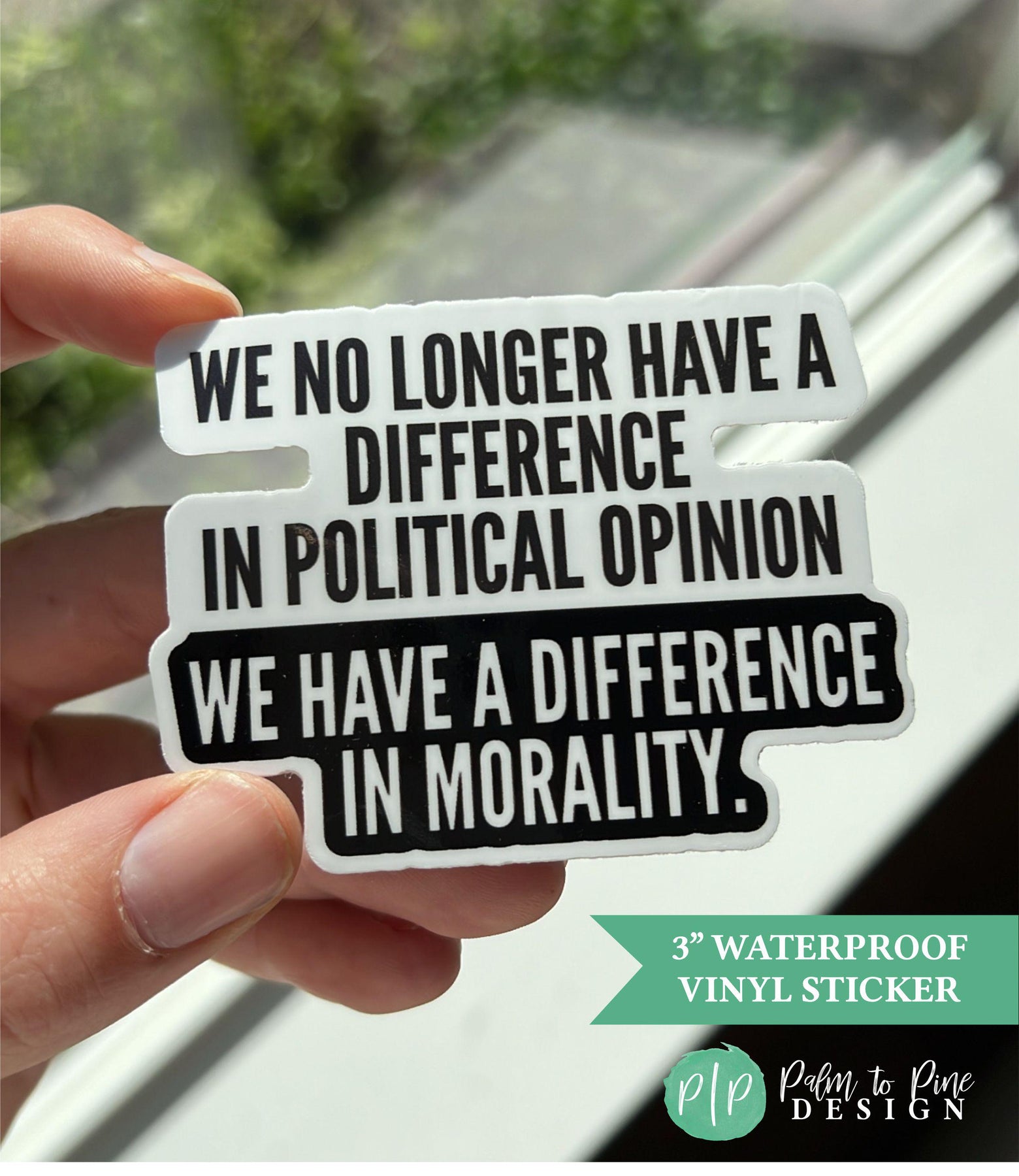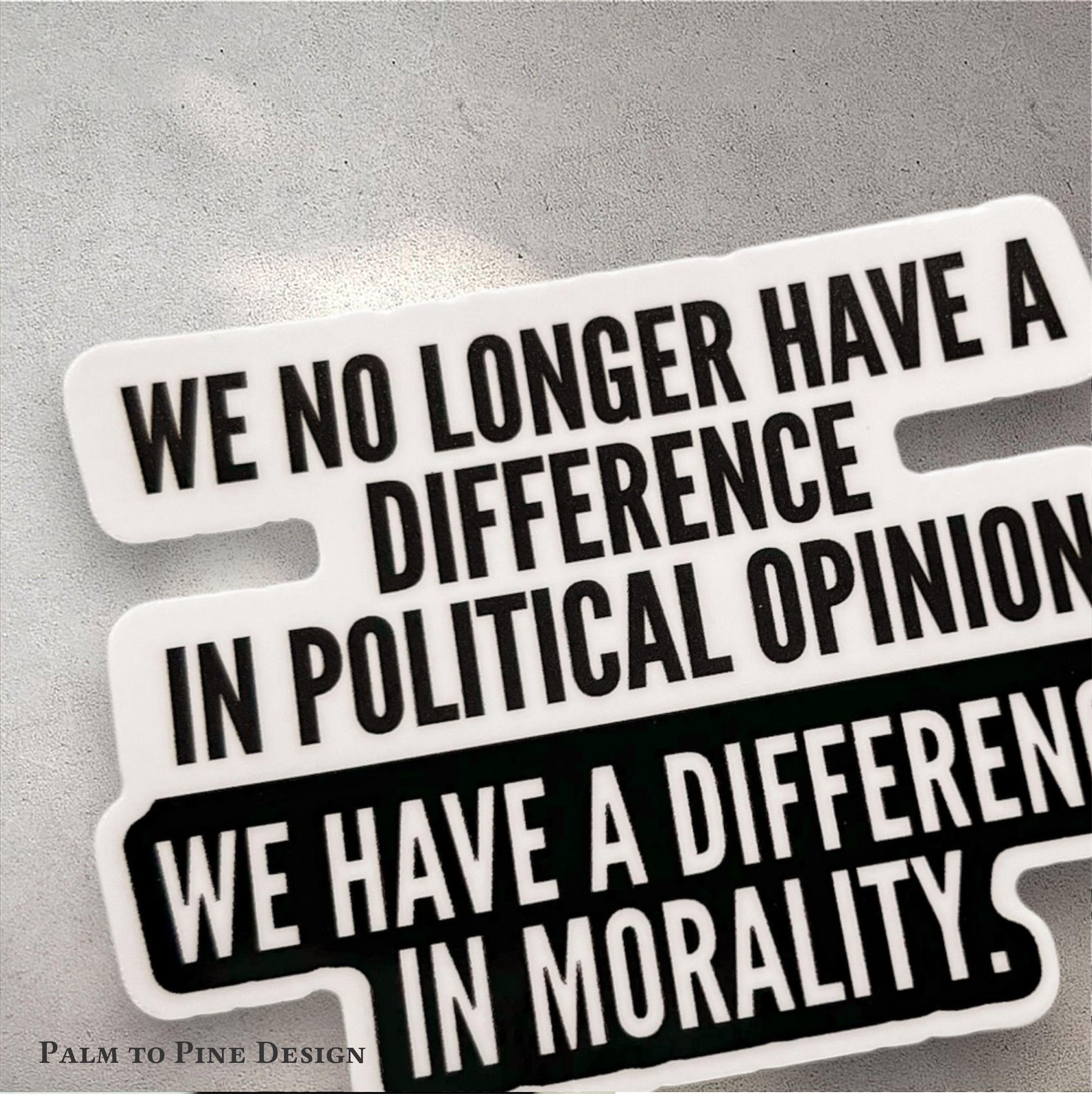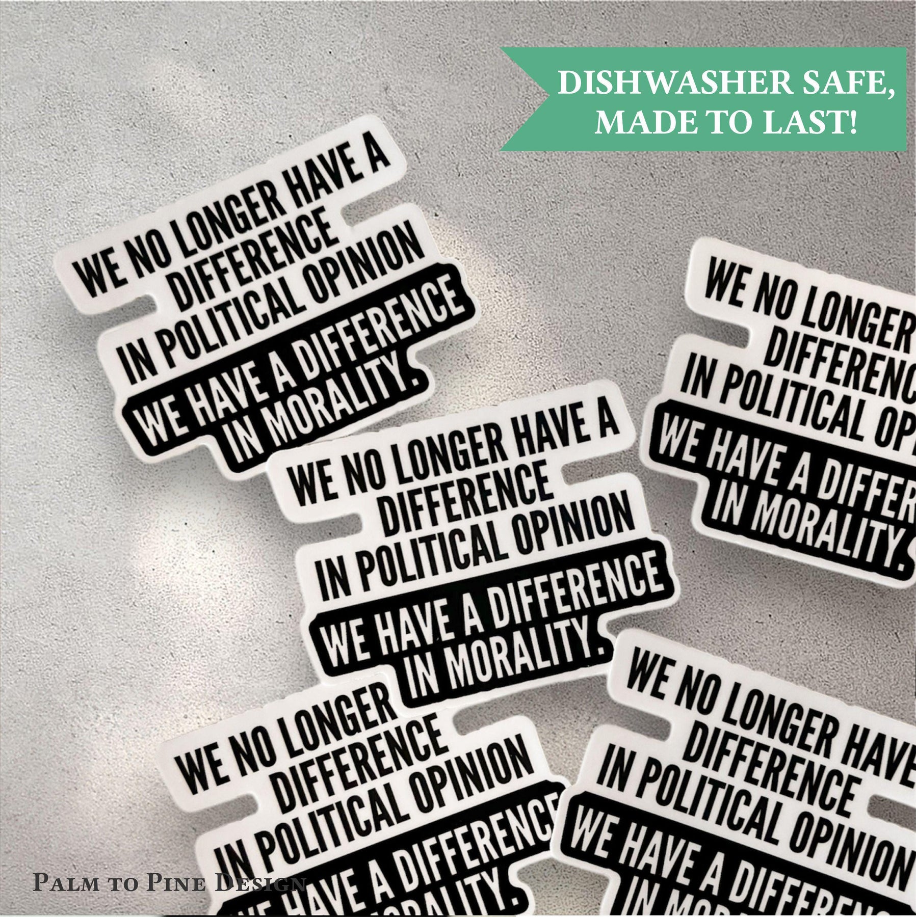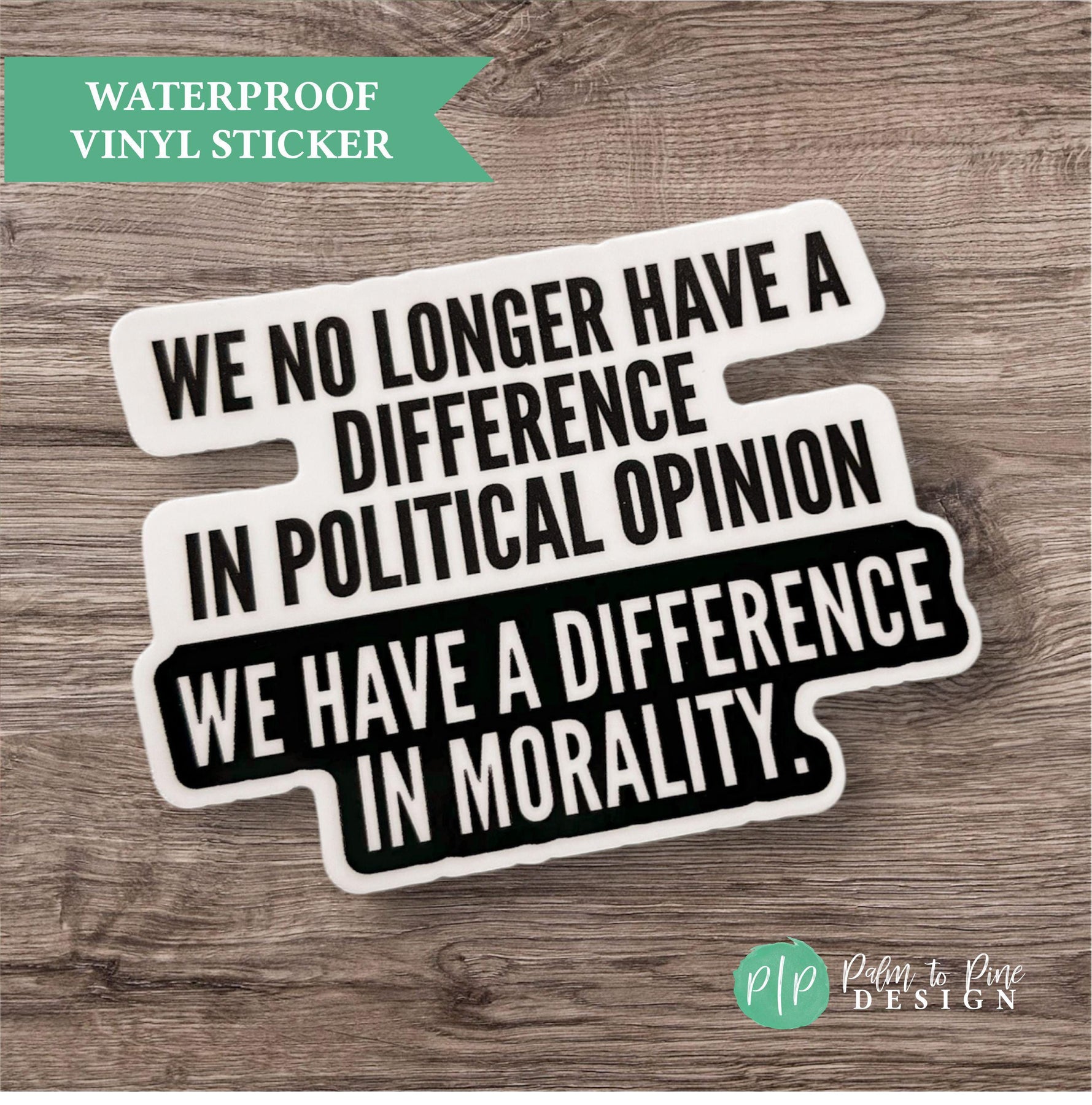 This Hands Off political vinyl waterproof sticker is the perfect way to raise awareness and demand justice and equality for a human rights voice that matters. This dishwasher safe resist sticker measures 3" long and the message reading "We no longer have a difference in political opinion, we have a difference in morality" supports democracy and anti-racism. Proudly put this waterproof democratic sticker on your water bottle, laptop, car bumper sticker or more and display it at activists protests, rallies or marches to defend democracy, bureaucracy, women's rights, immigration and more.