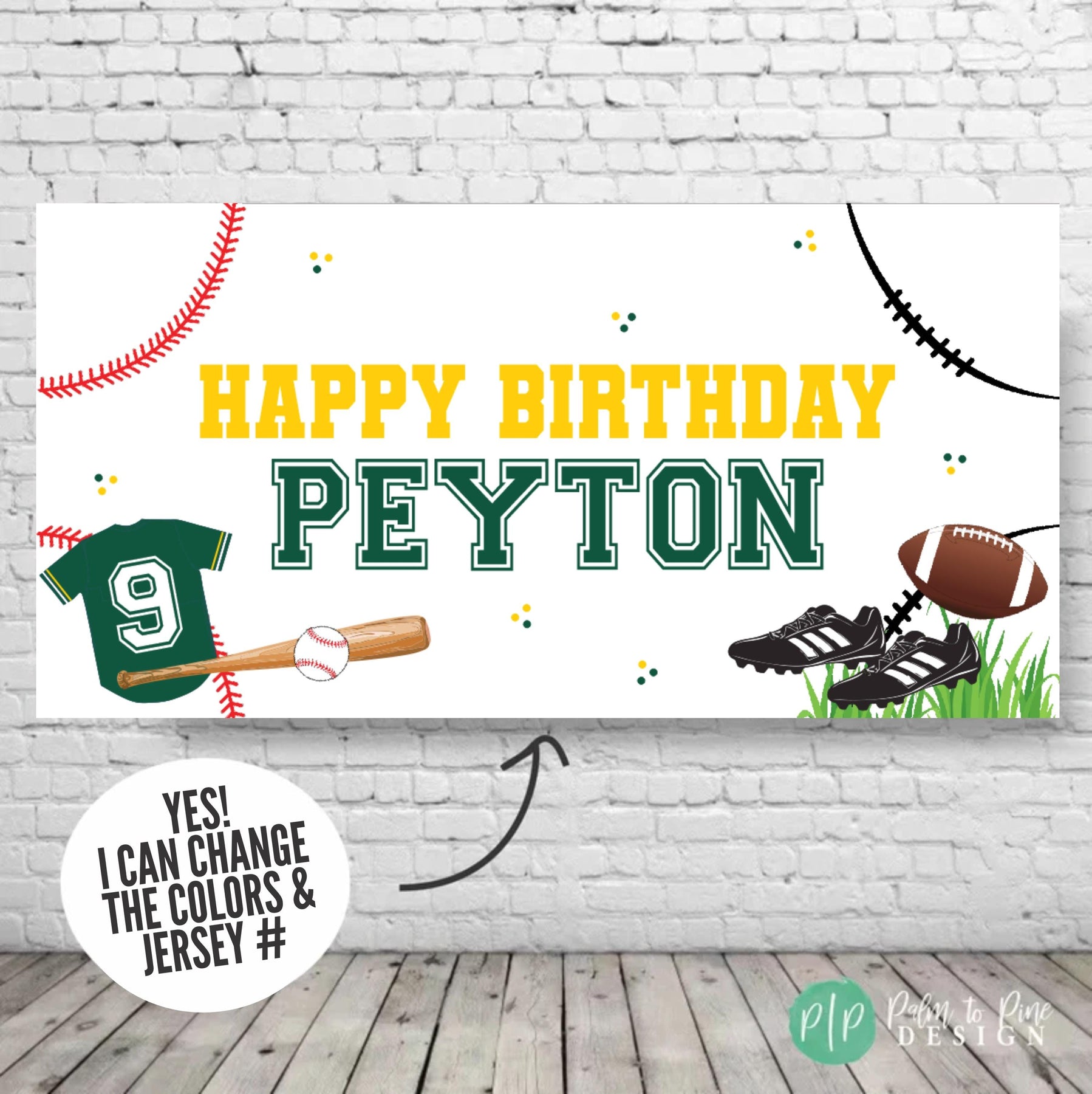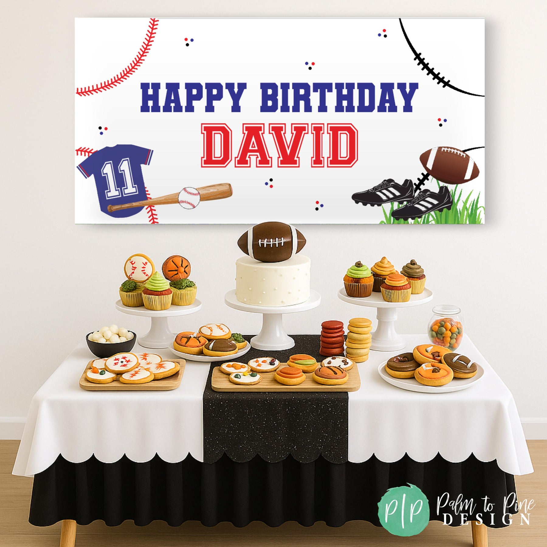 The banner features both football and baseball graphics, a sporty color scheme, and custom text to fit your child’s name and age. Whether you’re celebrating your little MVP’s first birthday or an all star double-digit year, this design is made to stand out.