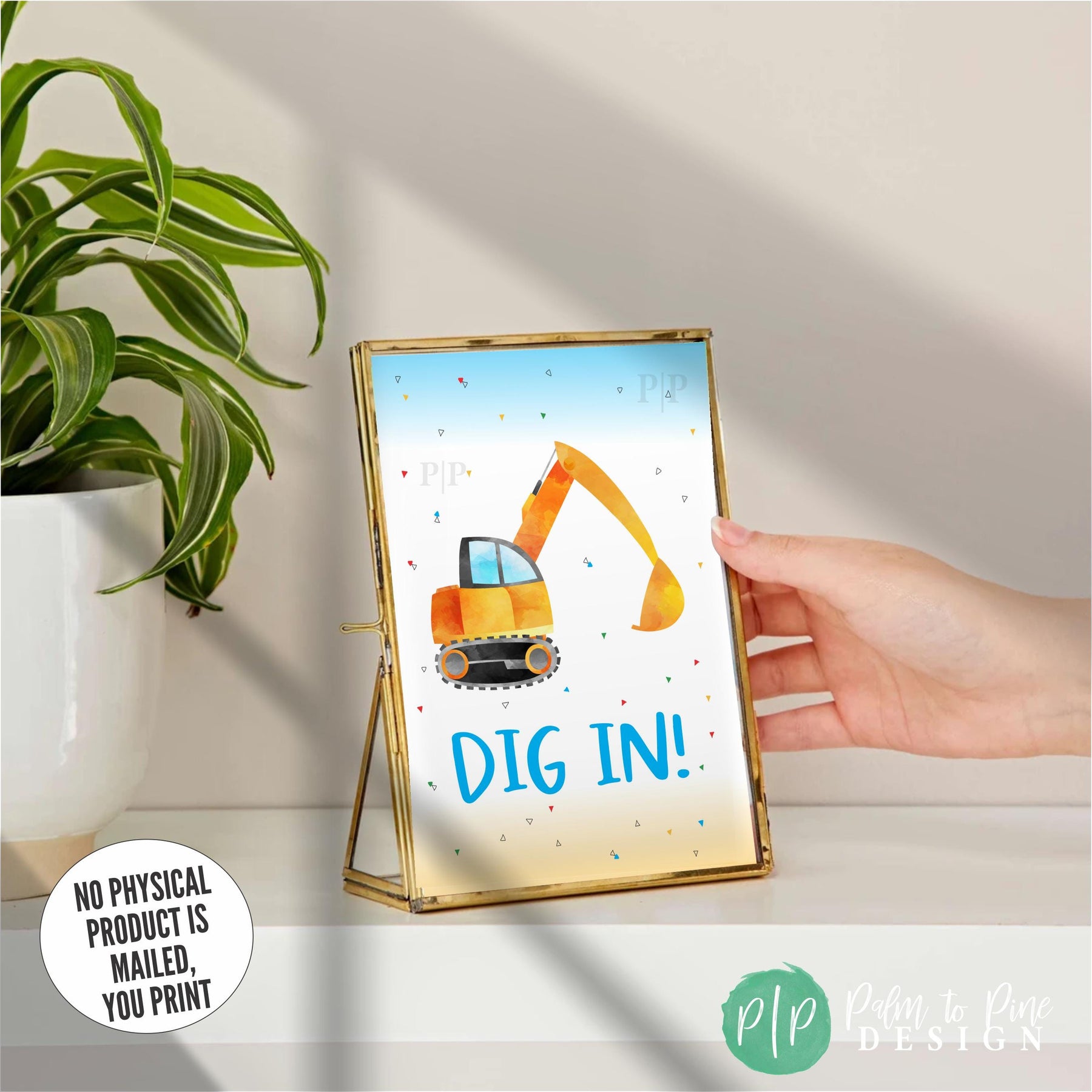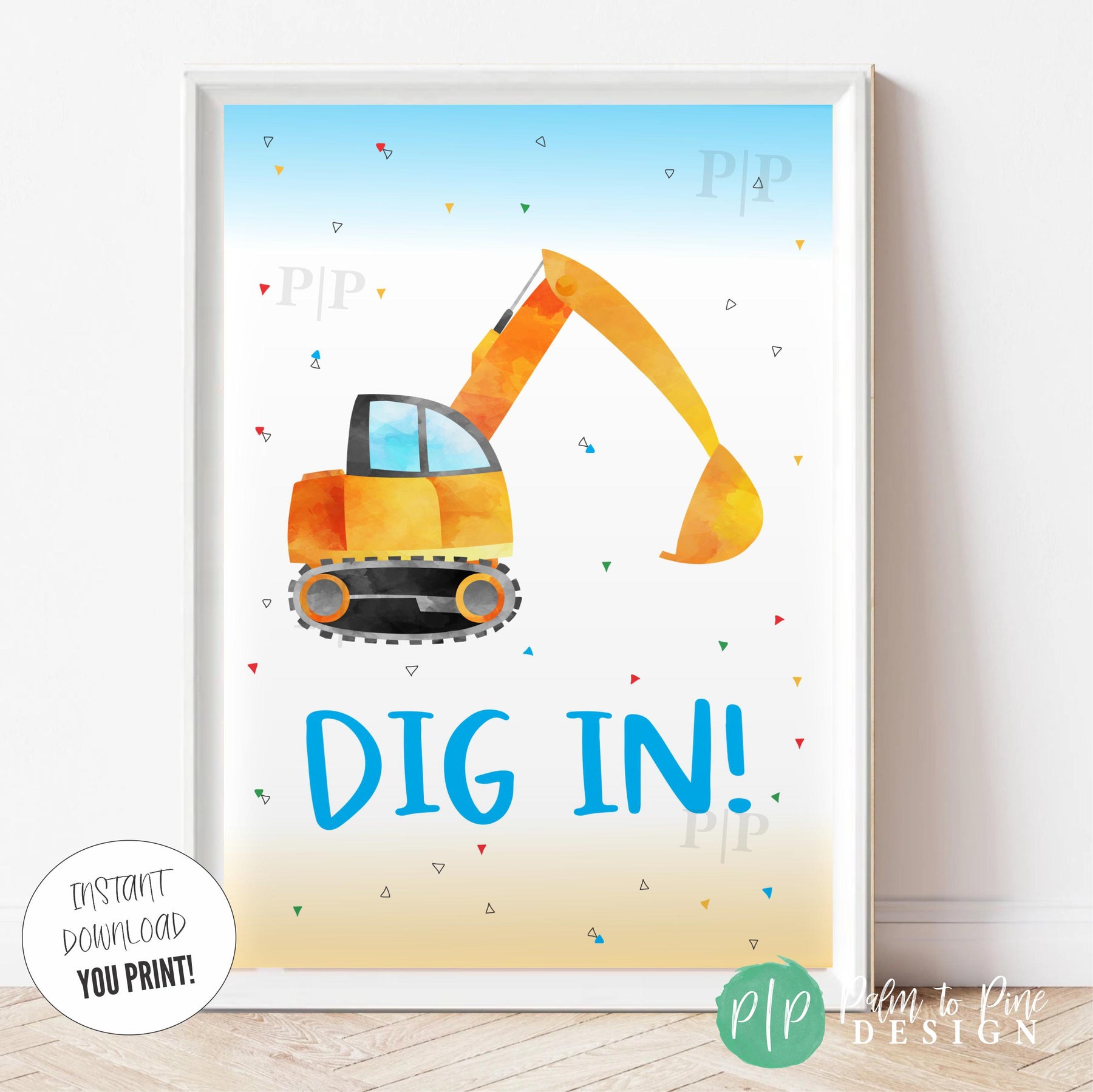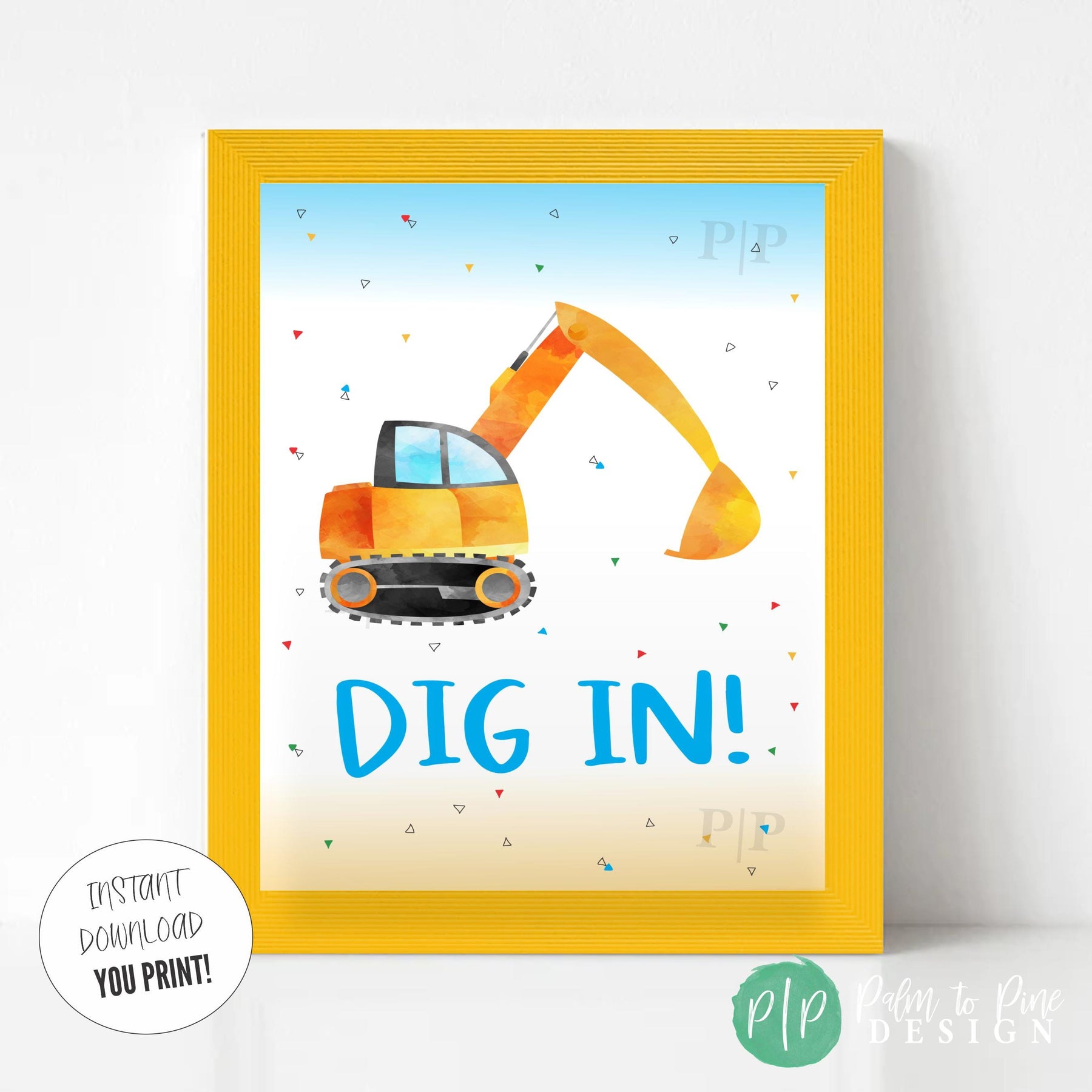 Make your construction, or things that go transportation party even more fun with this “Dig In” sign featuring a cute excavator! It’s the perfect decoration for a dessert table or food table at your boys party. Simply download, print, and display - no waiting, no shipping. This Transportation Birthday Sign is the perfect coordinating match to your Things that Go Birthday items from my shop for a one stop shop cohesive party style!
