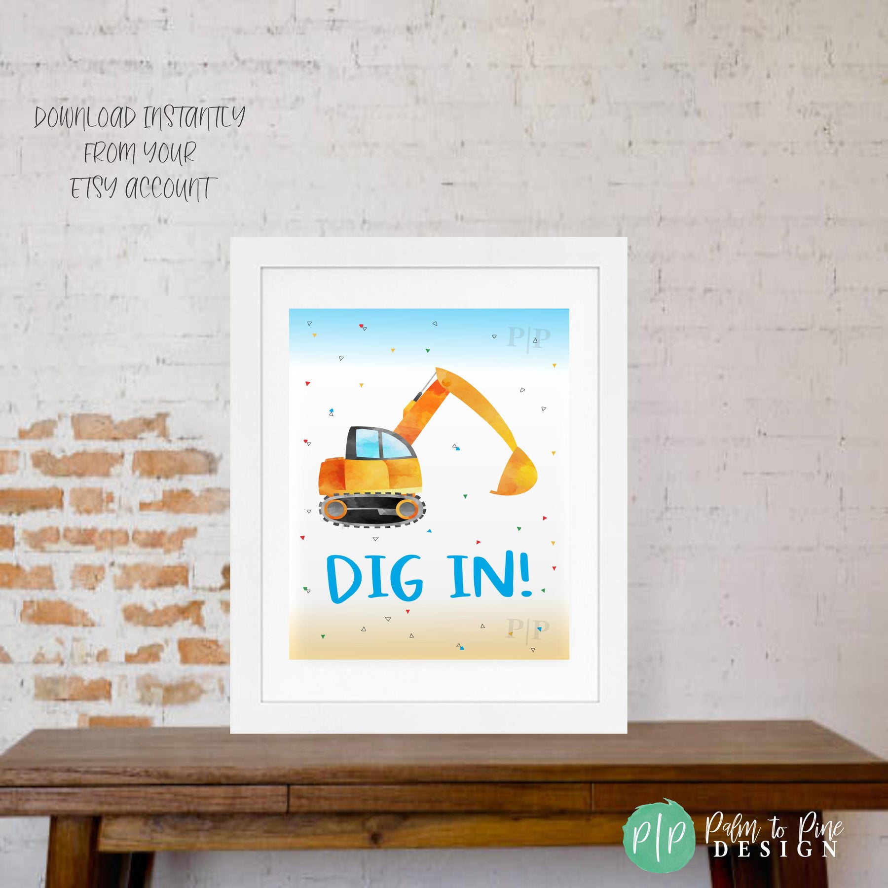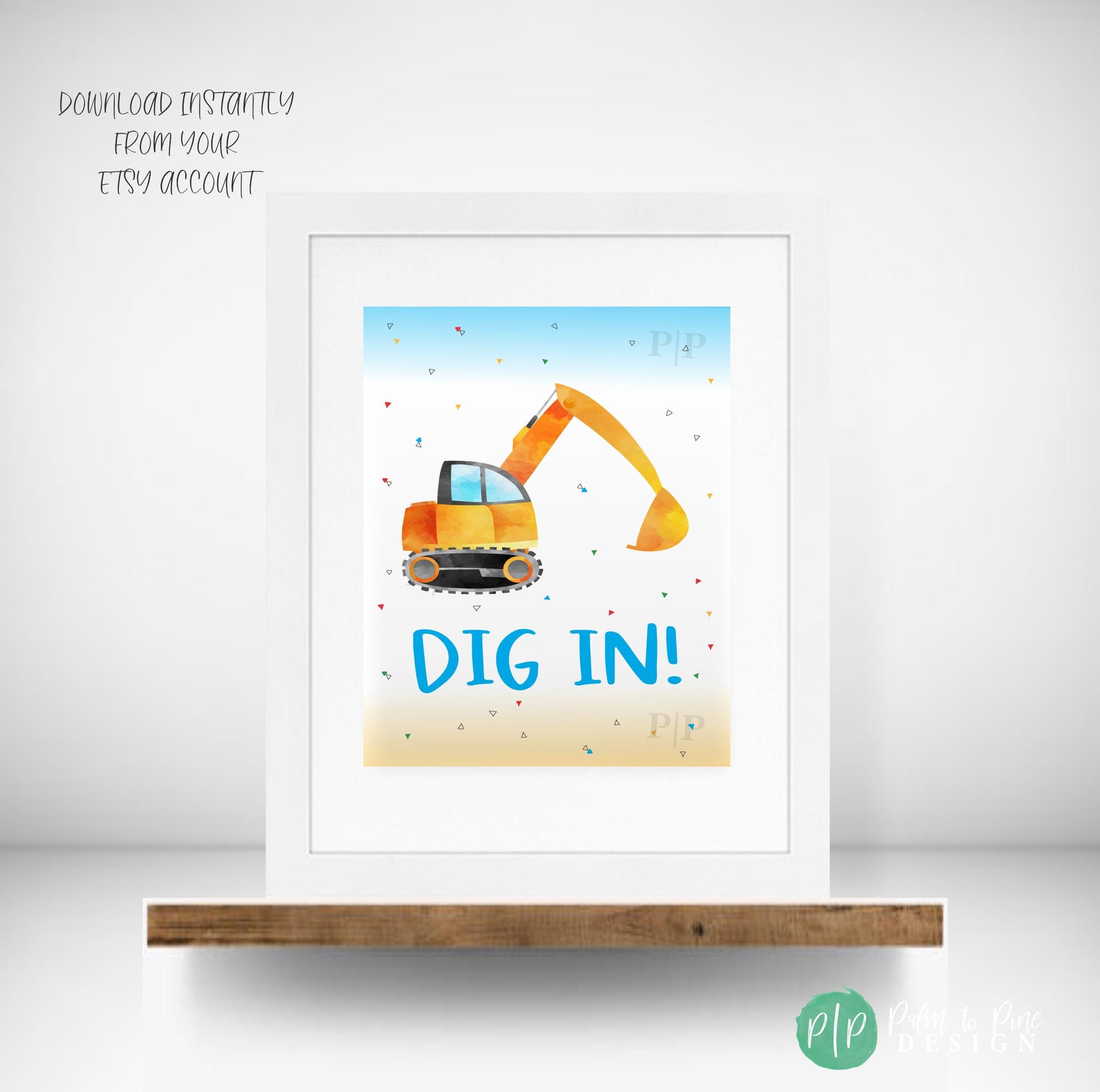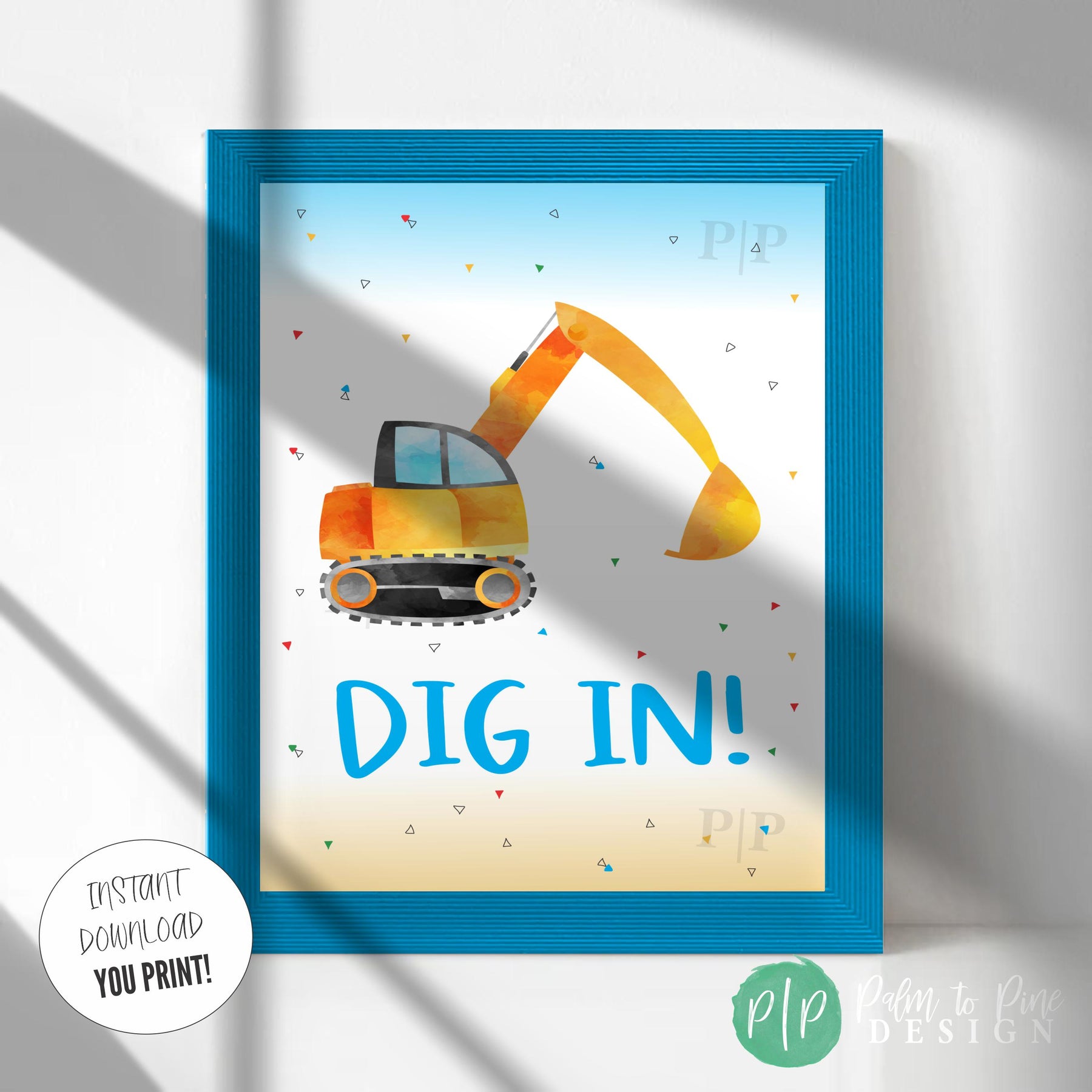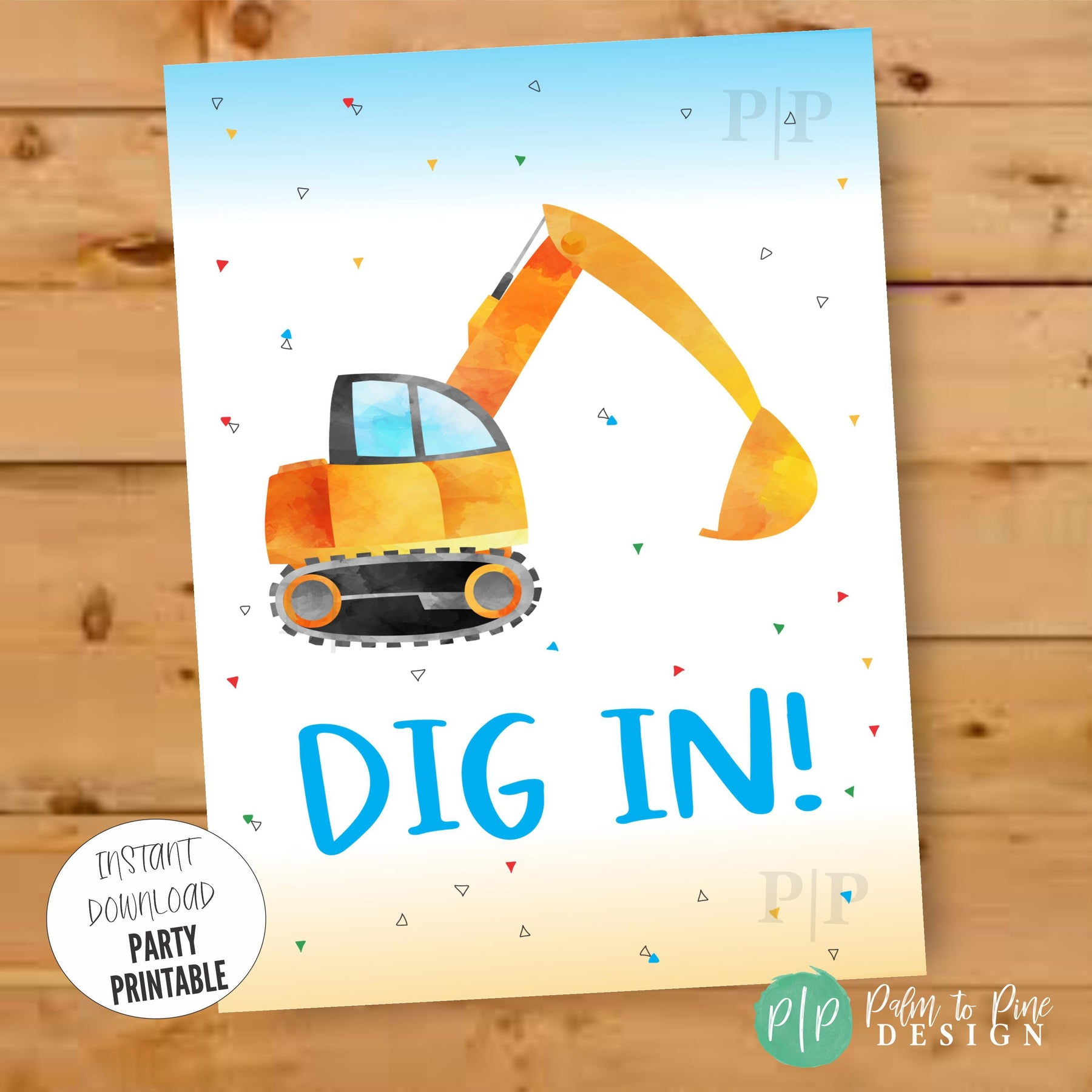 Make your construction, or things that go transportation party even more fun with this “Dig In” sign featuring a cute excavator! It’s the perfect decoration for a dessert table or food table at your boys party. Simply download, print, and display - no waiting, no shipping. This Transportation Birthday Sign is the perfect coordinating match to your Things that Go Birthday items from my shop for a one stop shop cohesive party style!
